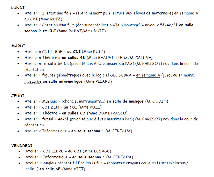 Liste des ateliers 2025-2026 durant la pause méridienne proposés à tous les collégiens par des enseignants.